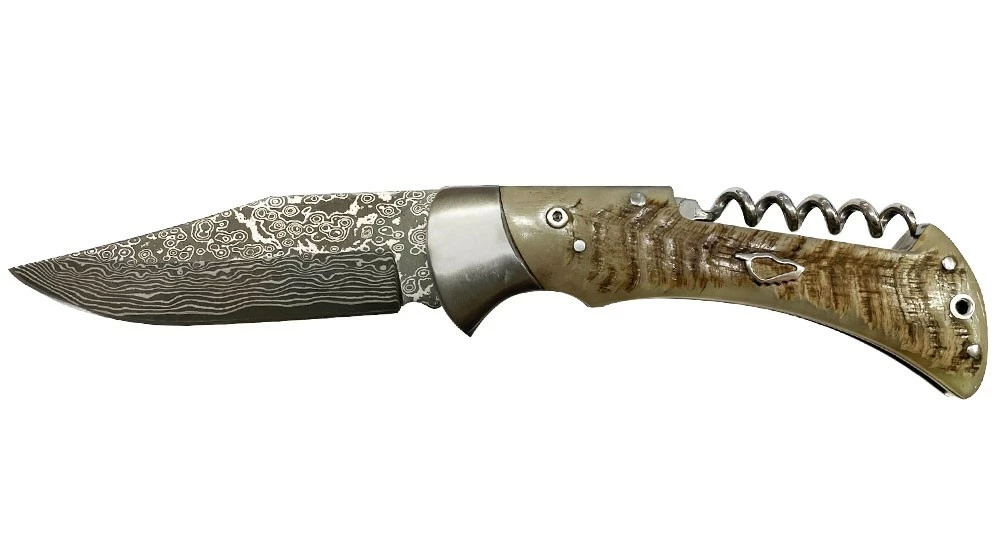 Découvrez ce couteau de berger pliant avec son tire-bouchon intégré dans sa version haut de gamme ! pour un rendu sophistiqué, la lame est en acier Damas ! Ce couteau de poche réunit les fonctionnalités du couteau Corse traditionnel, les techniques de fabrication moderne et la beauté d’une lame multicouche.