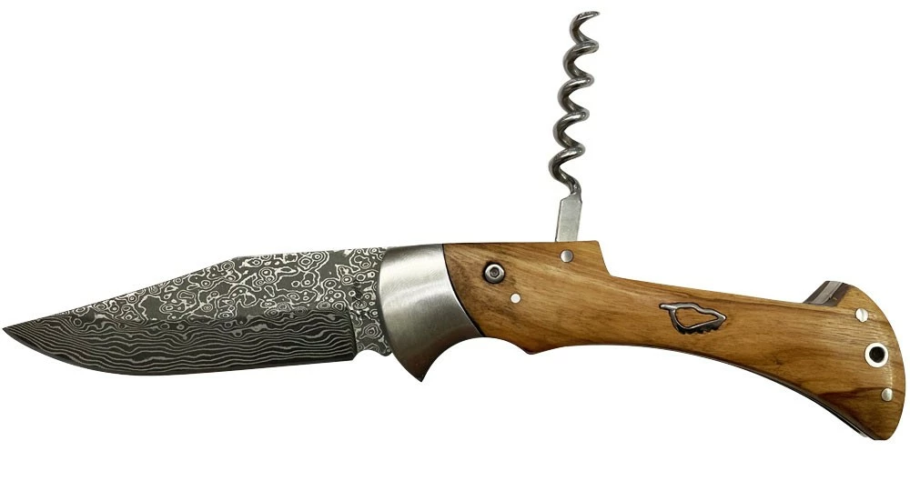 Couteau berger en Olivier avec Tire-Bouchon et lame Damas