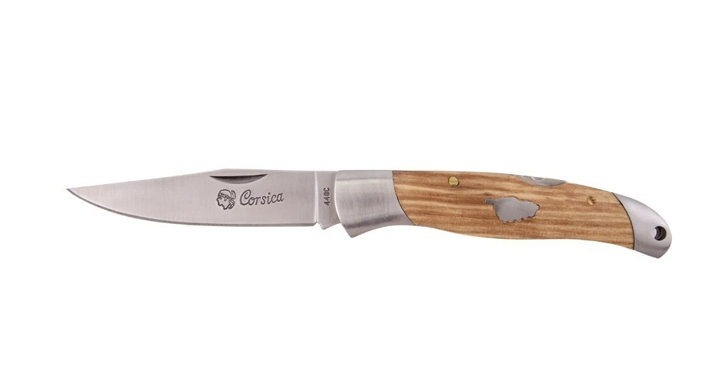 Il possède un manche ergonomique en véritable bois de Chêne, très agréable au toucher, avec une incrustation de la Corse en métal. La mitre arrière est percée ce qui permet de faire passer un lacet pour accrocher son couteau de poche. La lame gravée « Corsica » est en acier inoxydable de qualité et, elle a ce que l’on appelle un « onglet », un petite encoche pour l’ouvrir plus facilement à l’aide de son ongle. Pour être parfaitement en sécurité avec son couteau Corsica, un cran de sécurité lock-back permet de verrouiller et déverrouiller la lame.