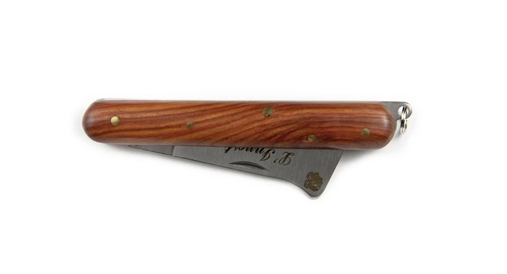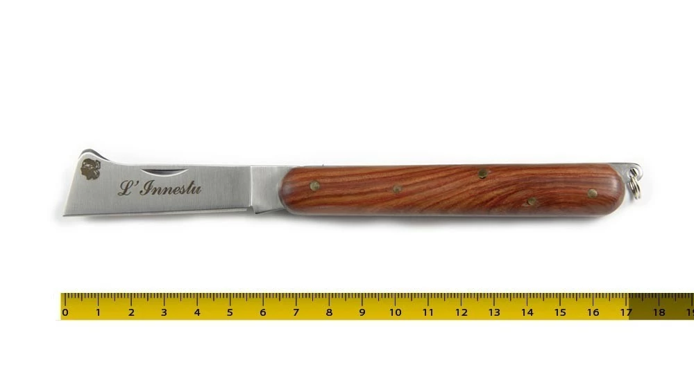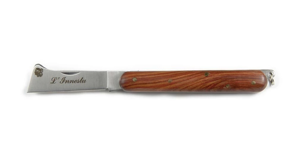 Couteau Corse pliant servant à greffer les plantes. Il possède un manche droit en bois d’arbousier avec un anneau d’attache au bout. Sa lame est droite avec un onglet.