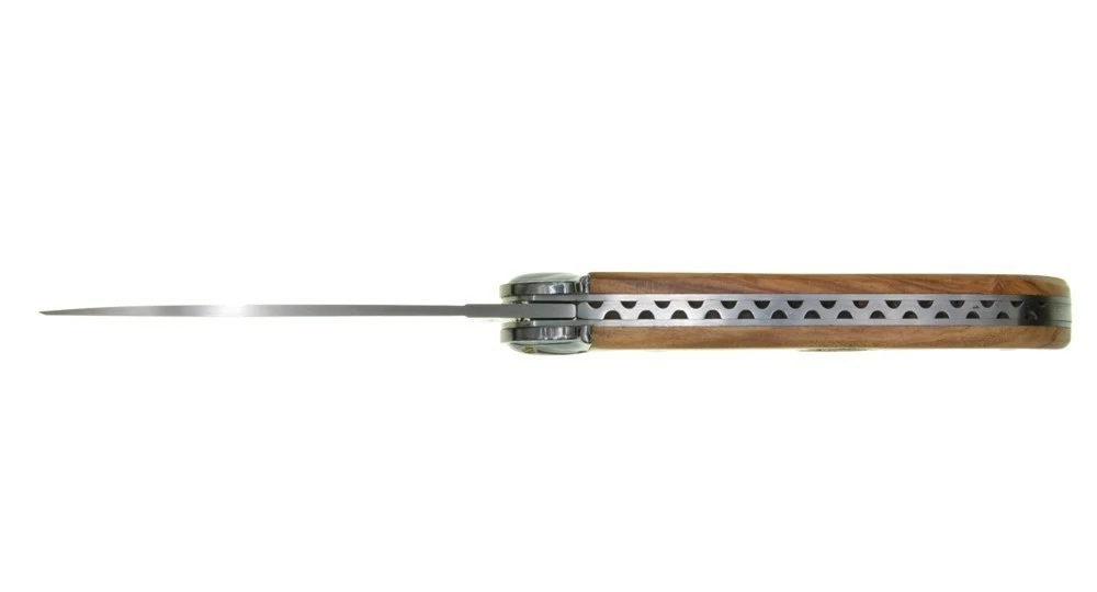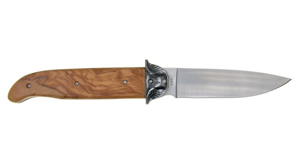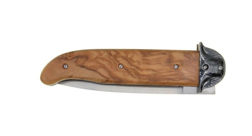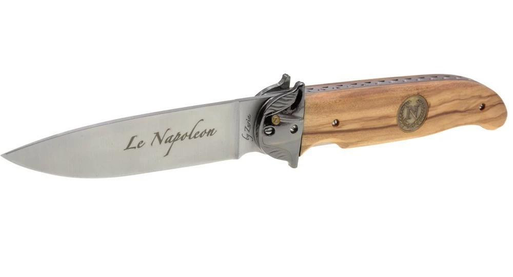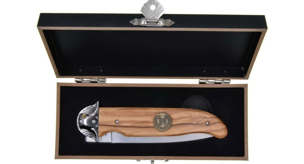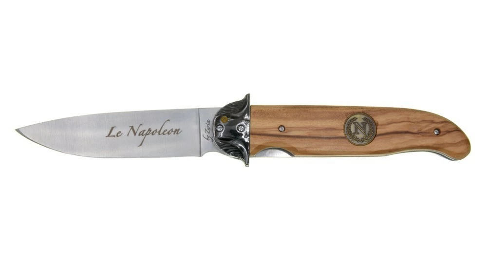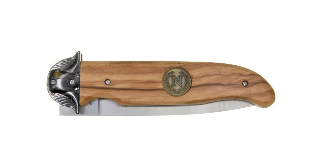 Le design de ce couteau pliant ne laisse aucun doute quant à son effigie, avec sa mitre en forme de chapeau de Napoléon et son écusson sur le manche en bois d’Olivier.