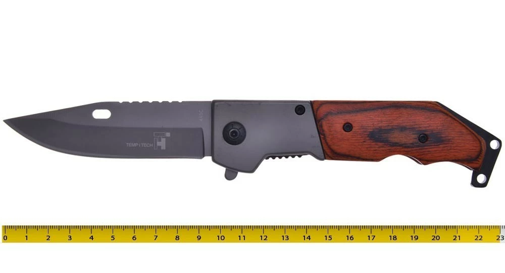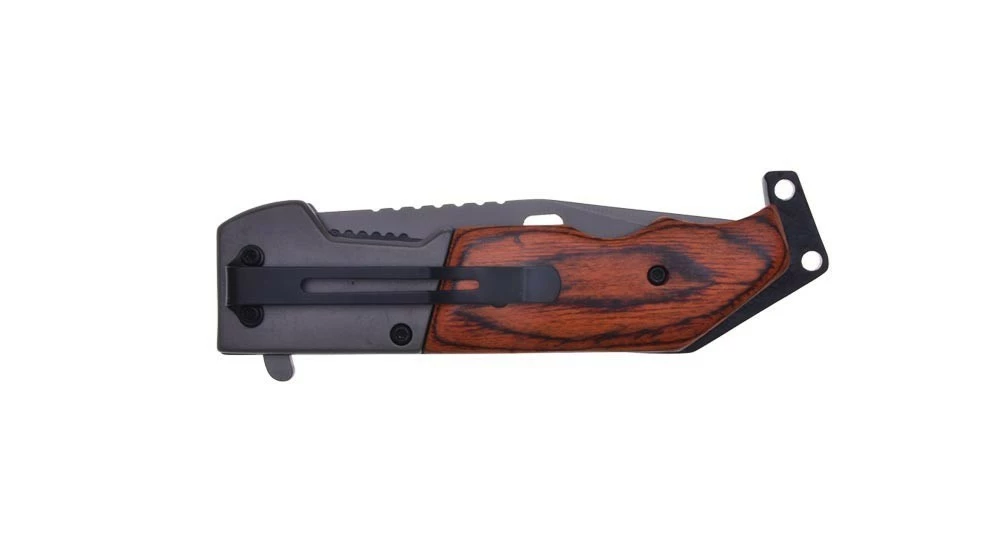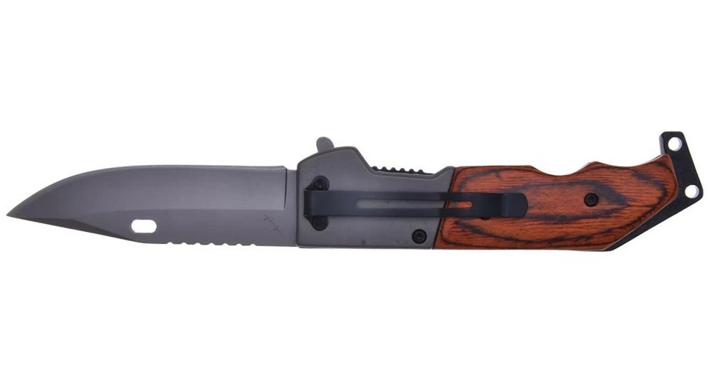Il possède un manche en Stamina, un bois composite teinté très résistant et imputrescible, une lame semi-guillochée de 9.5 cm et un système de sécurité Liner Lock.