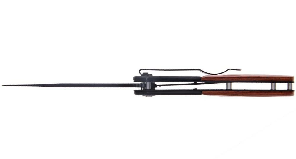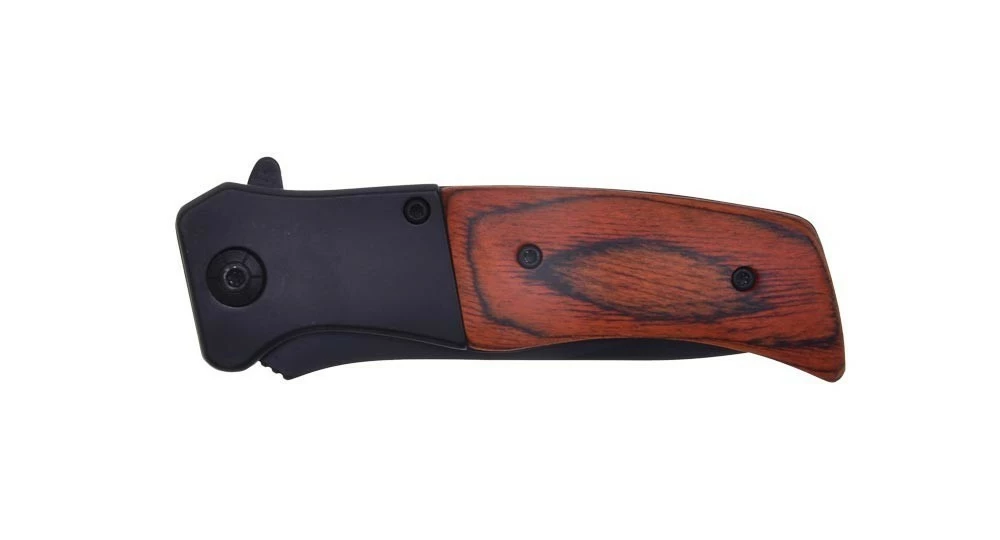La lame mesure 9 cm de long, elle est en acier inoxydable 440C noir tout comme la mitre. On retrouve au dessus de cette dernière un ergot d’index qui permet d’ouvrir le couteau d’une seule main, de façon semi-automatique.