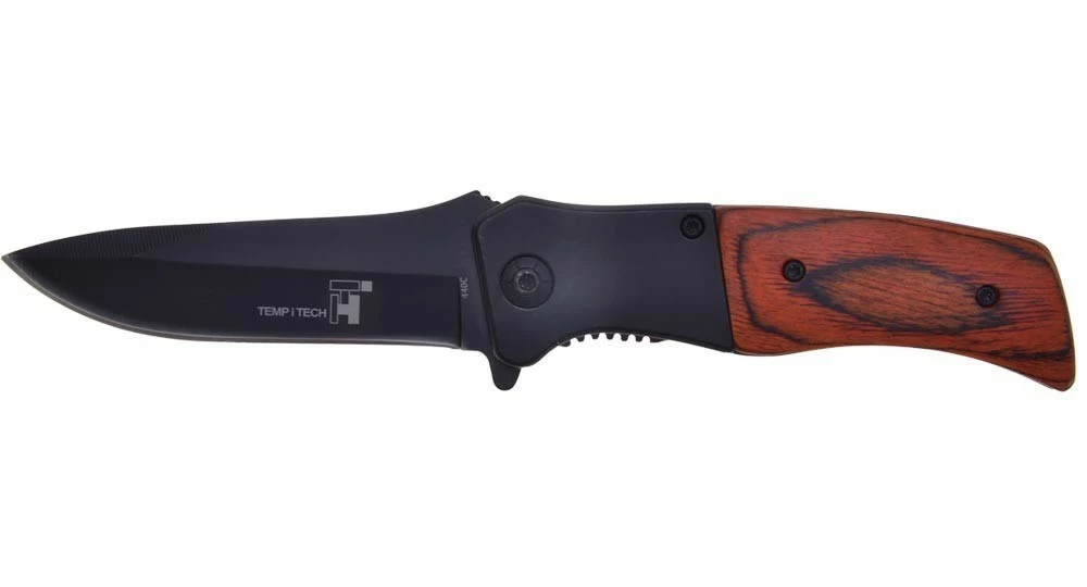 Le TEMP i TECH 1503 propose une autre version du couteau tactique avec une lame + mitre noires en acier 440C et un manche en stamina.