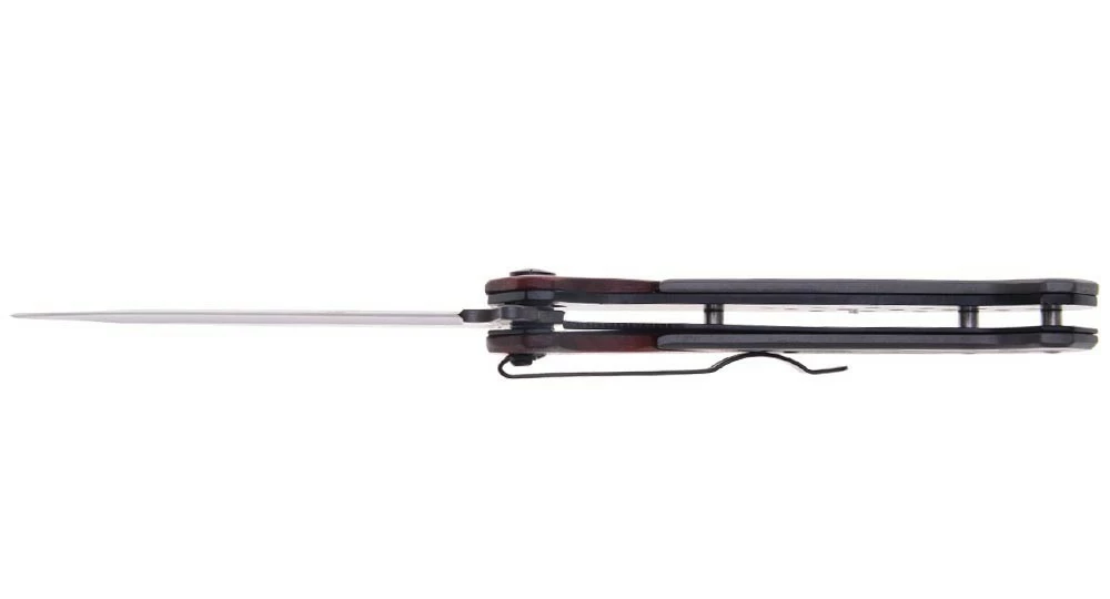 Ce couteau outdoor est original car les matières du manche et de la mitre ont été inversées. La mitre est en bois de Cocobolo et le manche en acier ajouré.