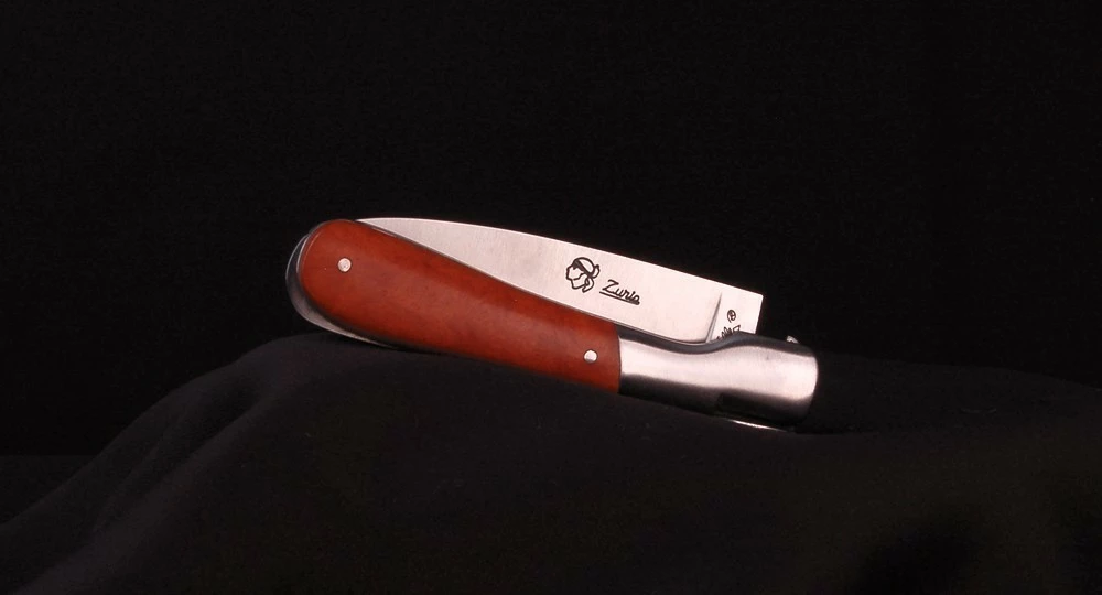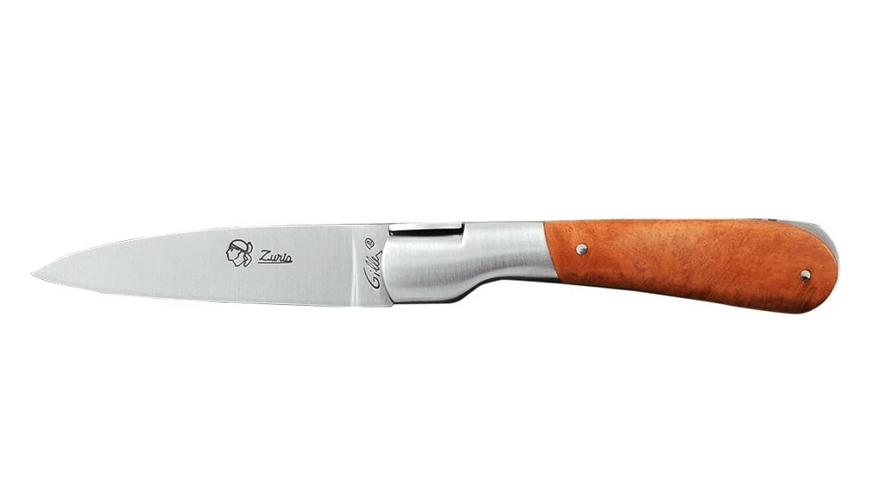 Ce couteau « Pialincu » mesure 10.5 cm fermé, ce qui est rare et adapté aux petites mains notamment celles des femmes. Son mécanisme est composé d’une seule pièce avec un cran de sécurité à l’arrière. Son manche est en bois naturel (olivier, chêne, genévrier, racine de bruyère …), en corne (vache, bélier) ou en os. Sa lame est en acier inoxydable « 14C28N » ou en « RWL 34 ». Il existe des modèles plus prestigieux montés avec une lame Damas.