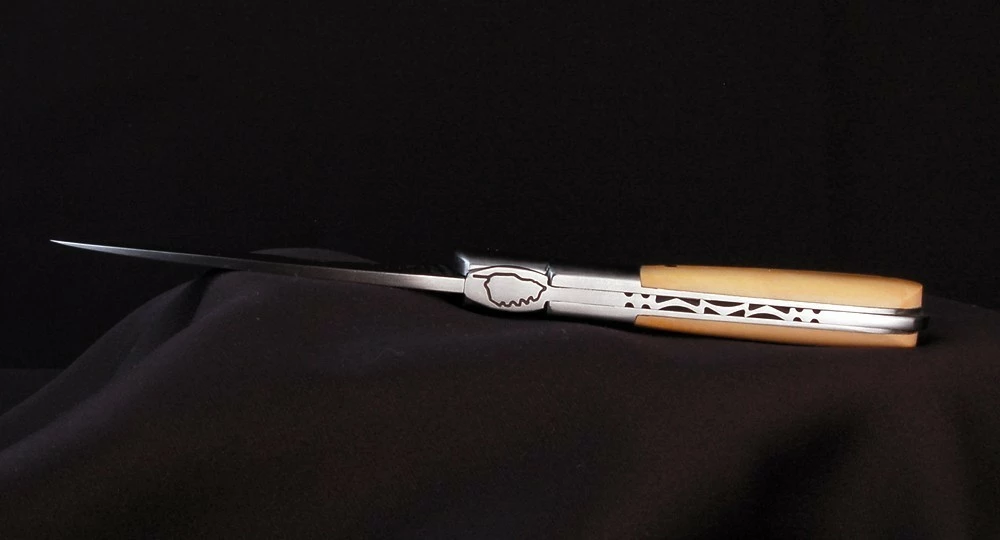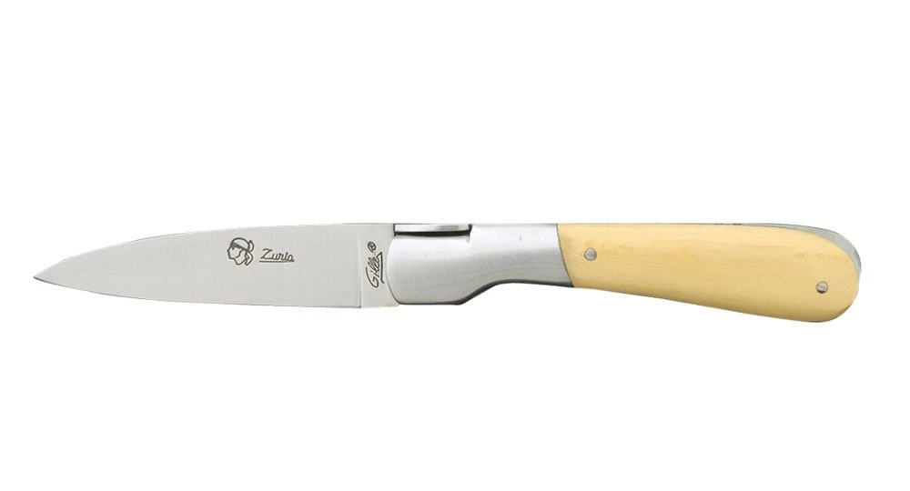 Ce couteau « Pialincu » mesure 10.5 cm fermé, ce qui est rare et adapté aux petites mains notamment celles des femmes. Son mécanisme est composé d’une seule pièce avec un cran de sécurité à l’arrière. Son manche est en bois naturel (olivier, chêne, genévrier, racine de bruyère …), en corne (vache, bélier) ou en os. Sa lame est en acier inoxydable « 14C28N » ou en « RWL 34 ». Il existe des modèles plus prestigieux montés avec une lame Damas.