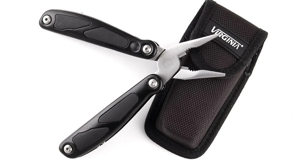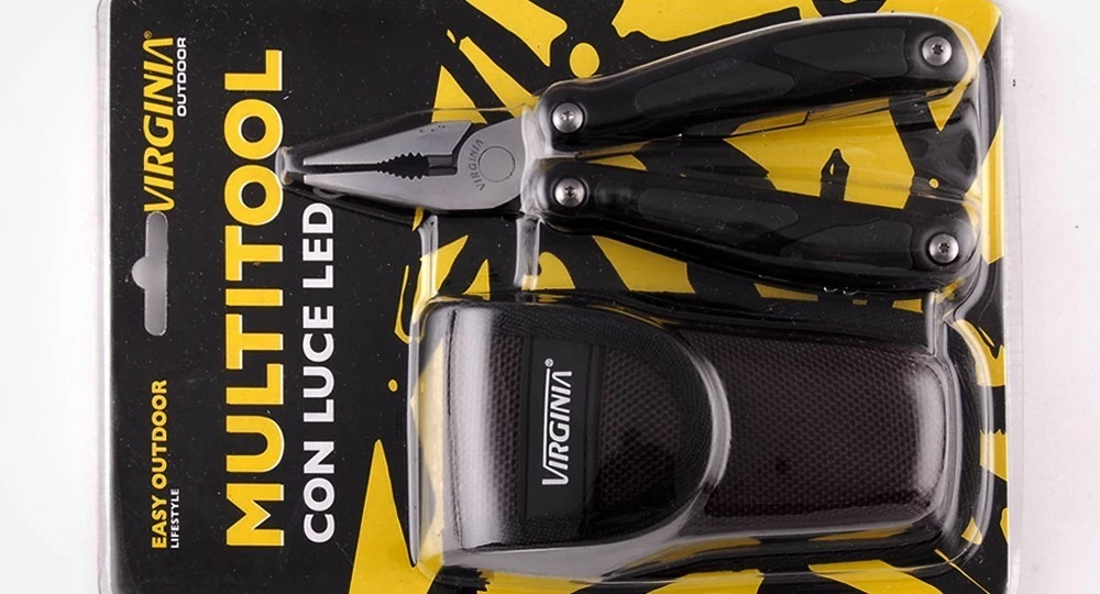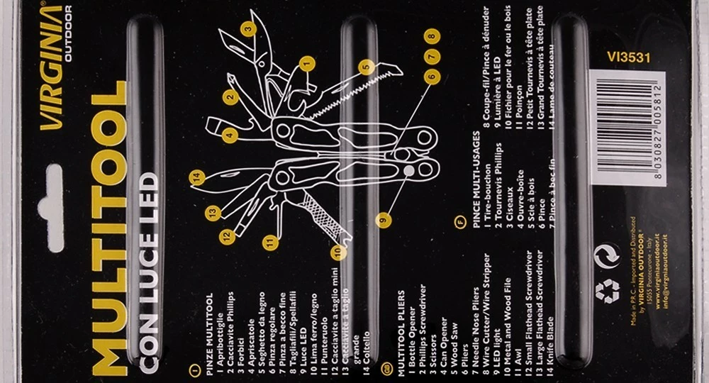 Multifonction : Tire-bouchon, tournevis Philipps, ciseaux, ouvre-boîte, scie à bois, pince, pince à bec fin, coupe-fil / pince à dénuder, lumière à LED, fichier pour le fer ou le bois, poinçon, petit tournevis à tête plate, grand tournevis à tête plate, lame de couteau.