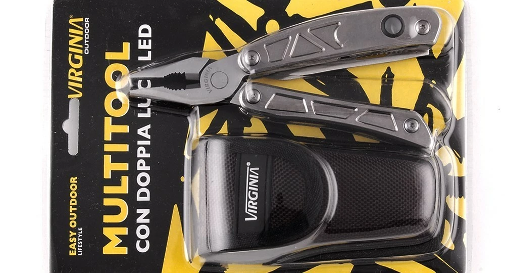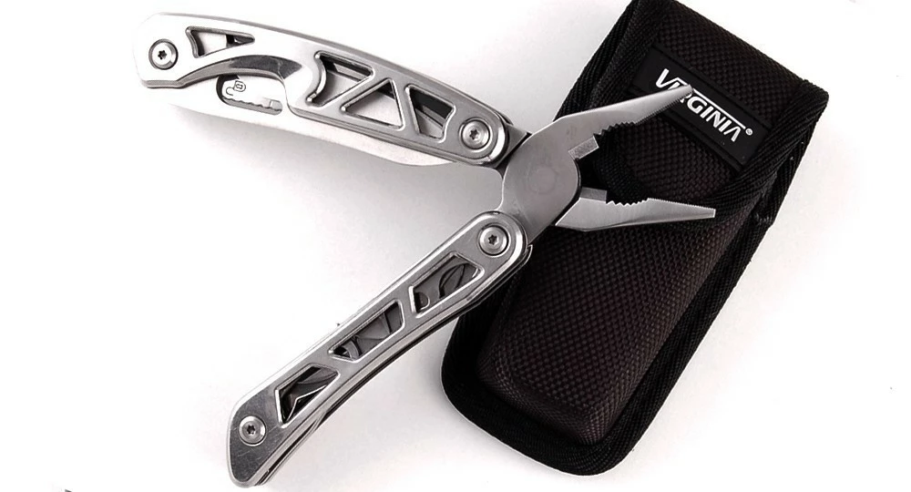 Multifonction : Ciseaux, tournevis Philipps, tournevis Ă tĂȘte plate, mousqueton, pince, pince Ă bec fin, coupe-fil / pince Ă dĂ©nuder, double lumiĂšre Ă LED, lame de couteau