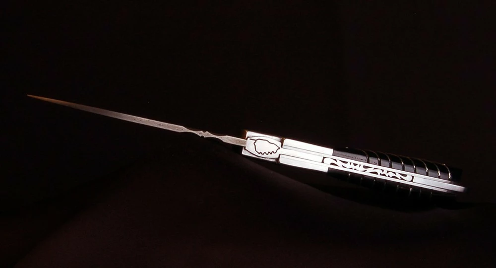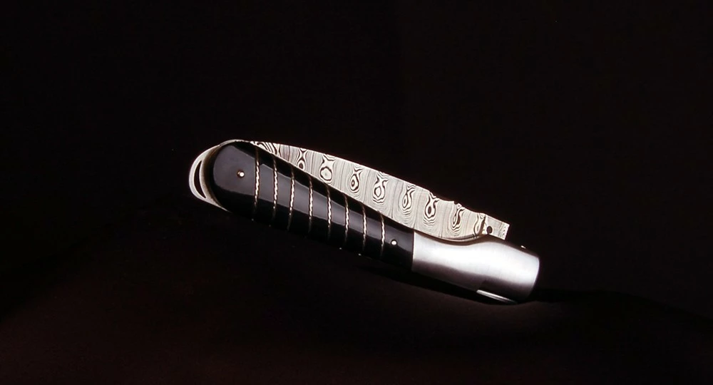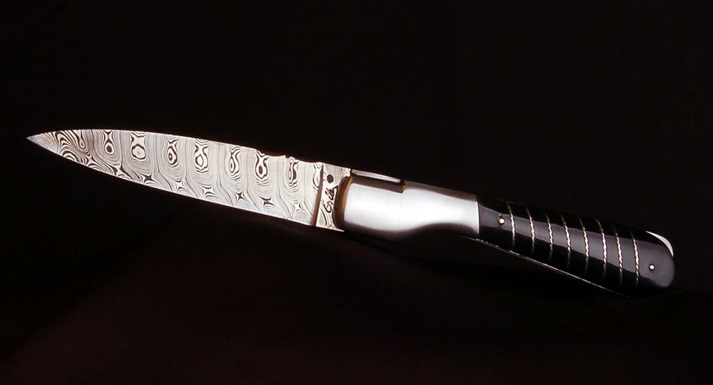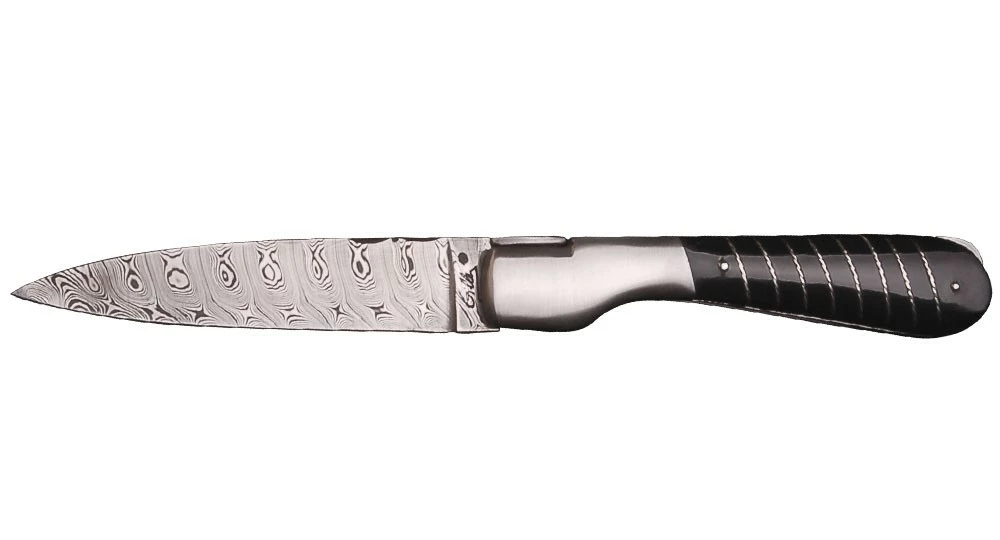 Ce somptueux modèle avec son manche en pointe de Corne noire ciselée en torsade et entourée d’un fil d’Argent massif tressé ainsi que sa lame en acier Damas, fait partie de la Collection très haut de gamme du Sperone ! un couteau pliant imaginé et designé en Corse par les couteliers Zuria de Bonifacio en étroite collaboration avec la maison Fontenille Pataud à Thiers et Robert Beillonnet, M.O.F 1997 et 2000.