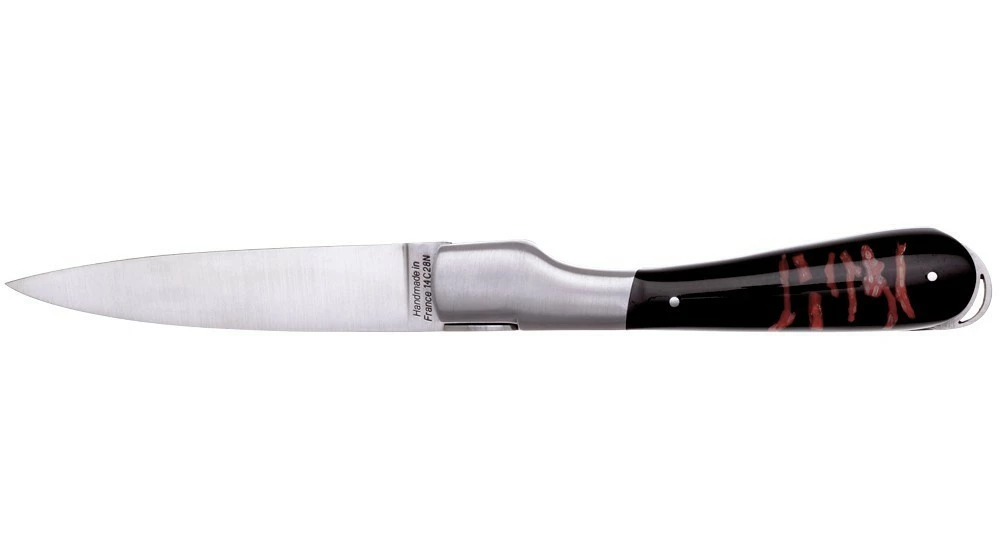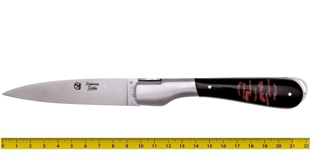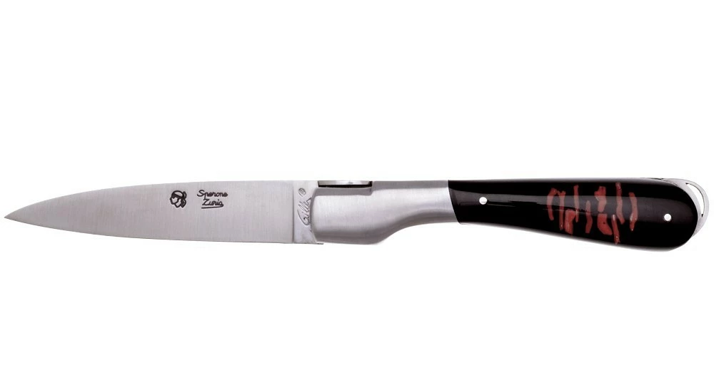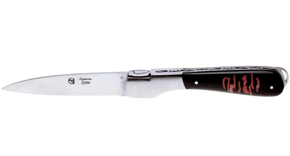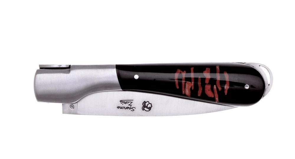 Avec son ouverture très douce et son système de blocage de lame par pompe arrière, la lame ne frappe pas le fond du couteau à la fermeture. Ses finitions dans les moindres détails, en font un couteau très agréable au quotidien : avec son ressort forgé, ciselé et poli à l’intérieur, la Corse gravée, des matières nobles et des aciers de qualité.