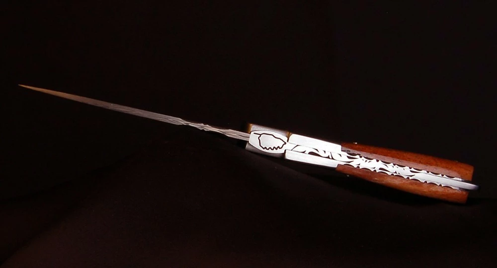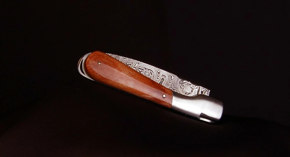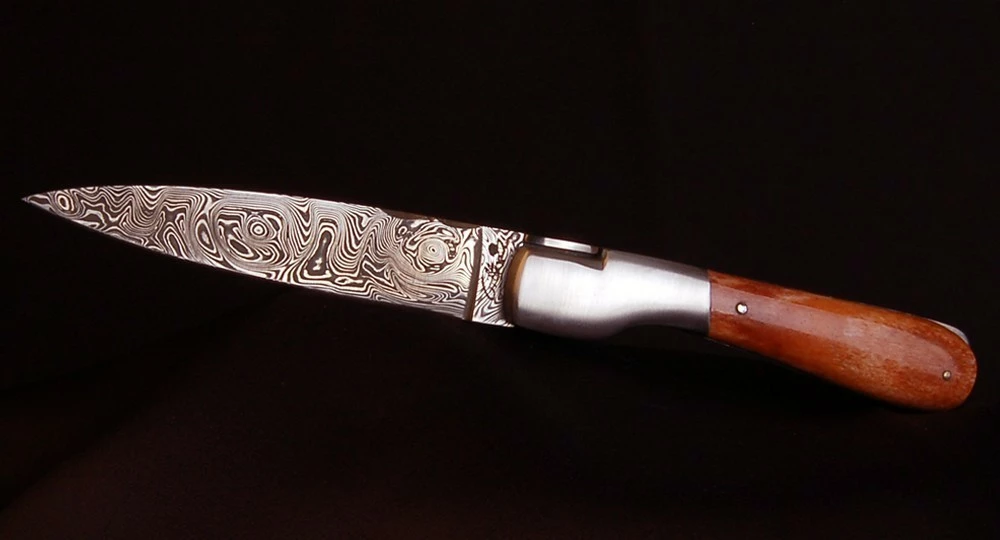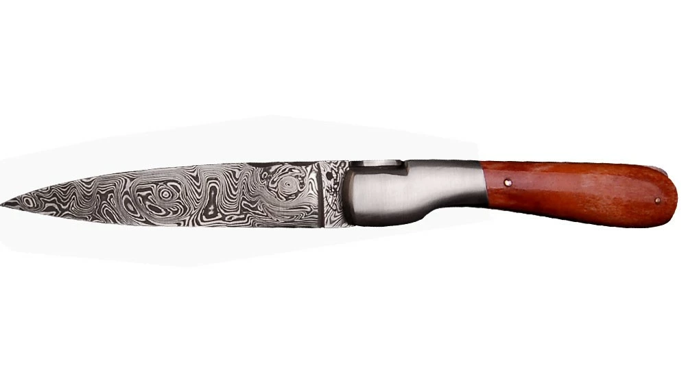 Matières nobles, acier exclusivement Damasteel® de très bonne qualité et finitions dans les moindres détails sont les principaux atouts de ce couteau. Son ressort est forgé, ciselé et poli à l’intérieur et la Corse est gravée sur la mouche qui est forgée aussi.