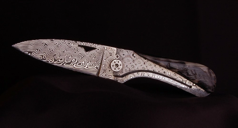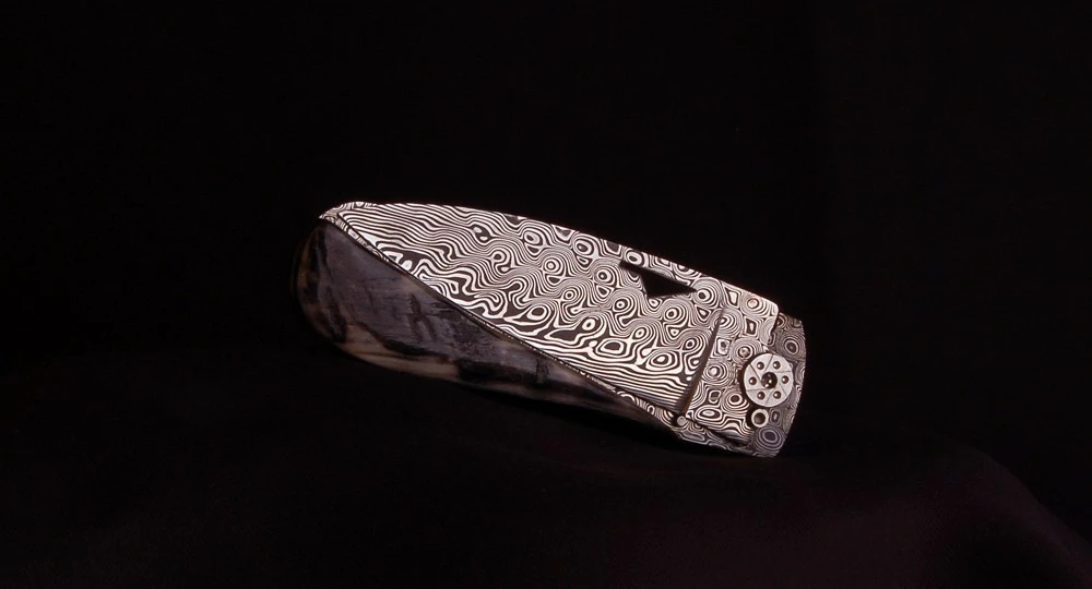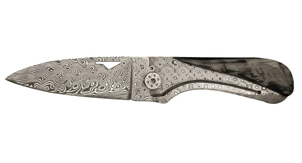 – Lame & Platine : Lame de 2.5 mm d’épaisseur en acier Damas intégral « Rose » inoxydable 120 couches. Dureté obtenue après trempe : 57 Hrc