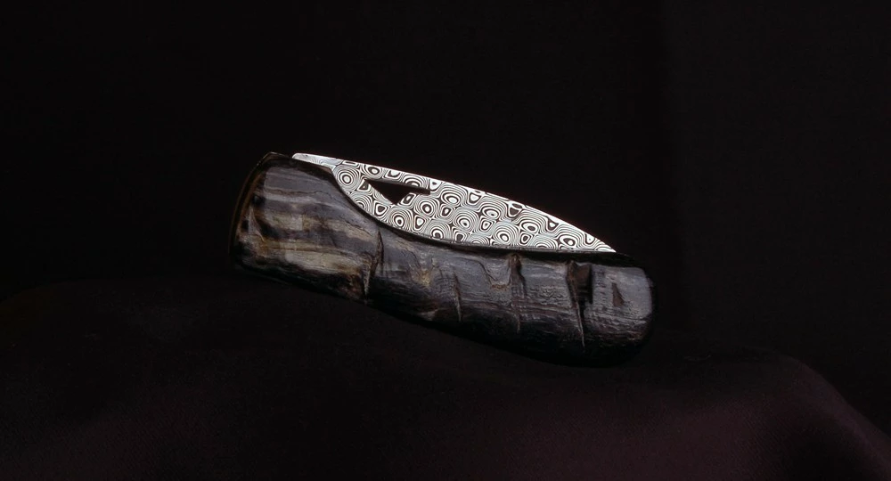 Couteau « fait main » : U Cumpà en Corne de Bélier noire et lame en Damas Rose