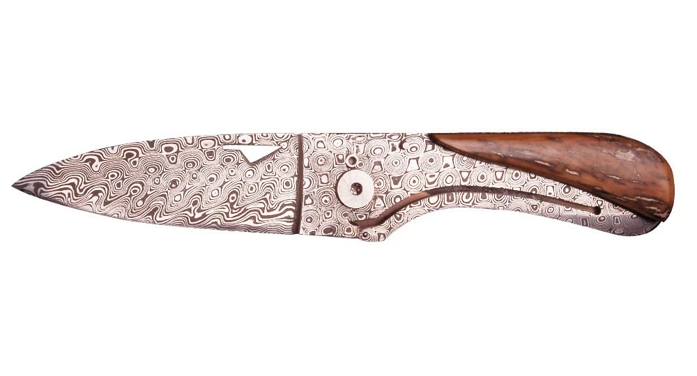 – Lame & Platine : Lame de 2.50 mm d’épaisseur en acier Damas intégral « Rose » inoxydable 120 couches. Dureté obtenue après trempe : 57 Hrc