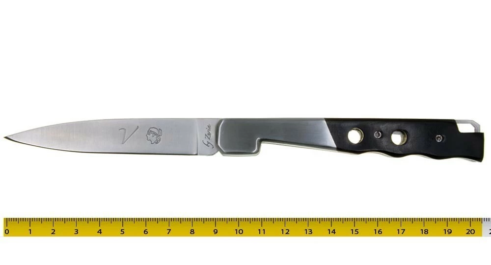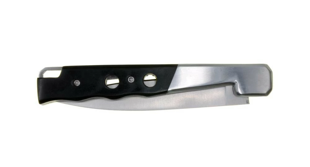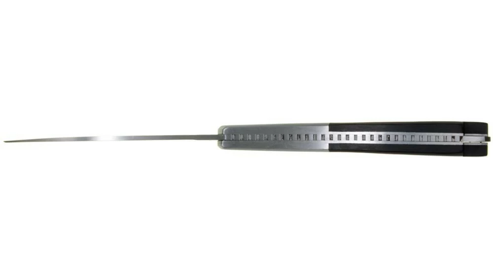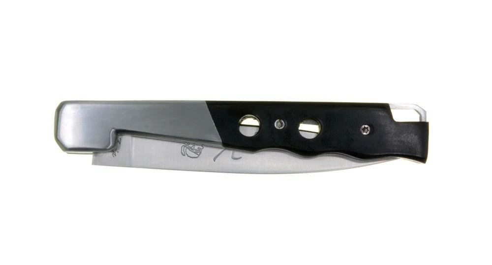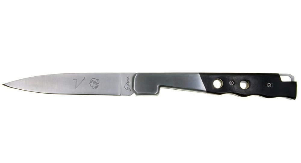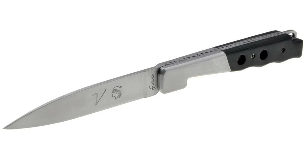 Ce couteau de poche a la silhouette du couteau Vendetta mais certains détails nous sortent du design classique aux formes arrondies et nous projetent plutôt vers un couteau futuriste avec son manche percé, son ressort et son cran de sûreté aux formes géométriques ainsi que sa mitre facetée.