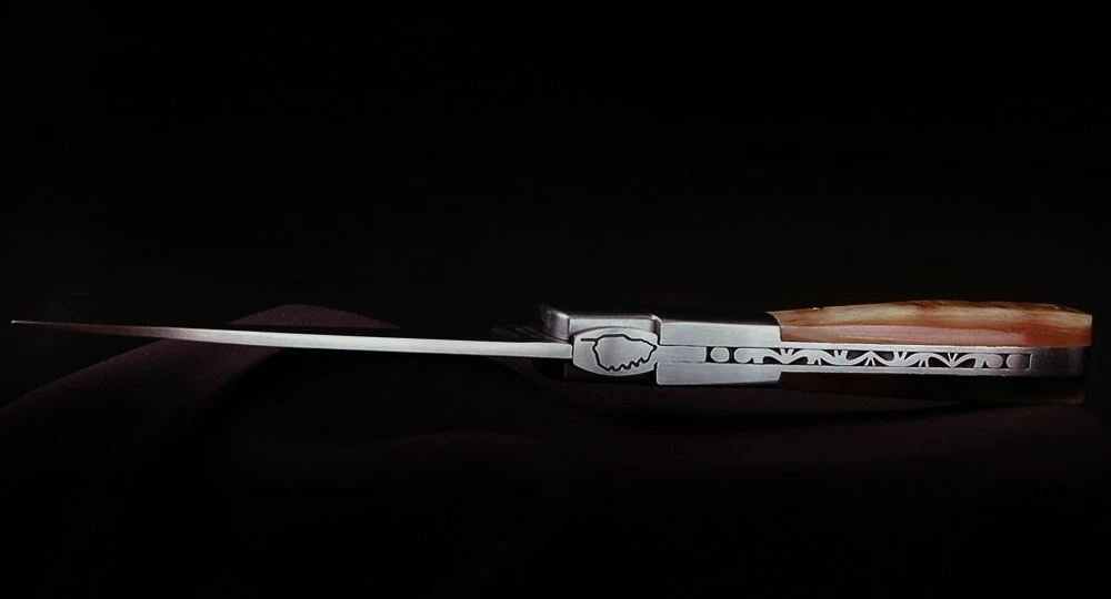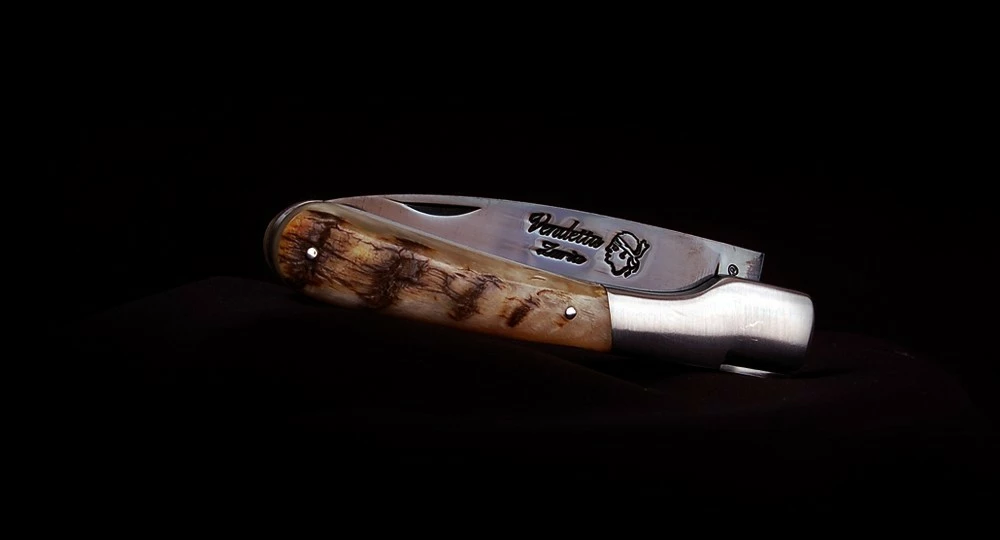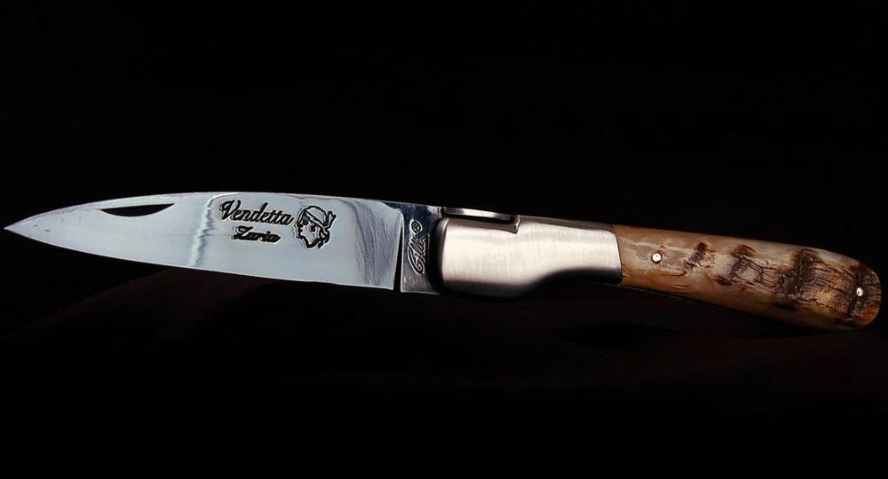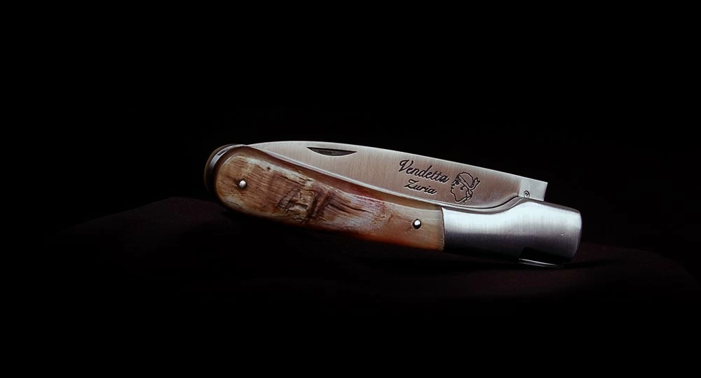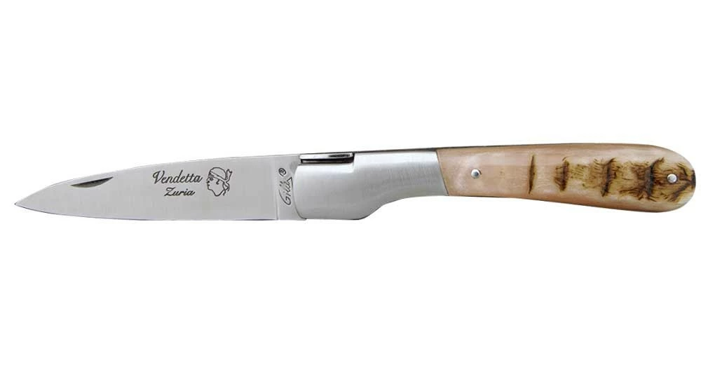 La Vendetta Zuria possède un système à cran forcé et un ressort à butée de lame empêche que celle-ci ne frappe le fond du couteau à la fermeture. Son ressort massif est forgé et poli à l’intérieur, la Corse est gravée sur le dessus, et elle est déclinée dans des matières nobles et des aciers de qualité.