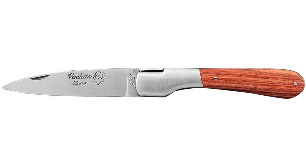 La Vendetta Zuria en bois de rose est disponible en acier inoxydable 14C28N et en acier Carbone XC 75 Brossé. Elle est livrée avec un étui ceinture en cuir.