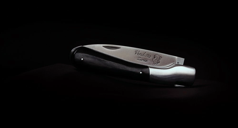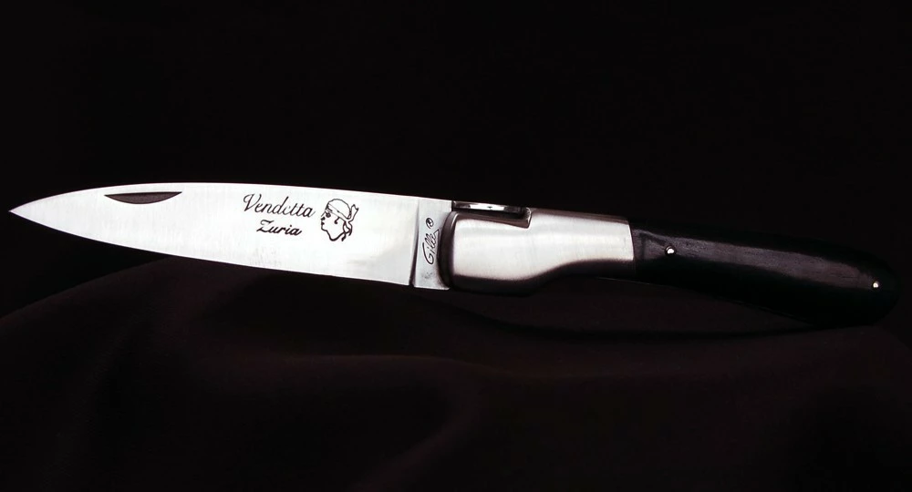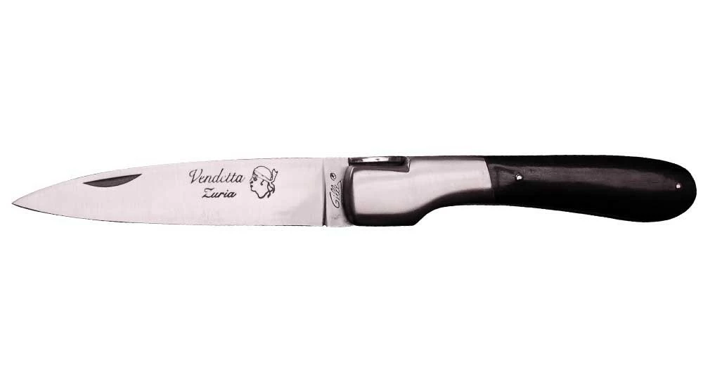 La Vendetta Zuria possède un système à cran forcé et un ressort à butée de lame empêche que celle-ci ne frappe le fond du couteau à la fermeture. Son ressort massif est forgé et poli à l’intérieur, la Corse est gravée sur le dessus, et il est décliné dans des matières nobles et des aciers de qualité.
