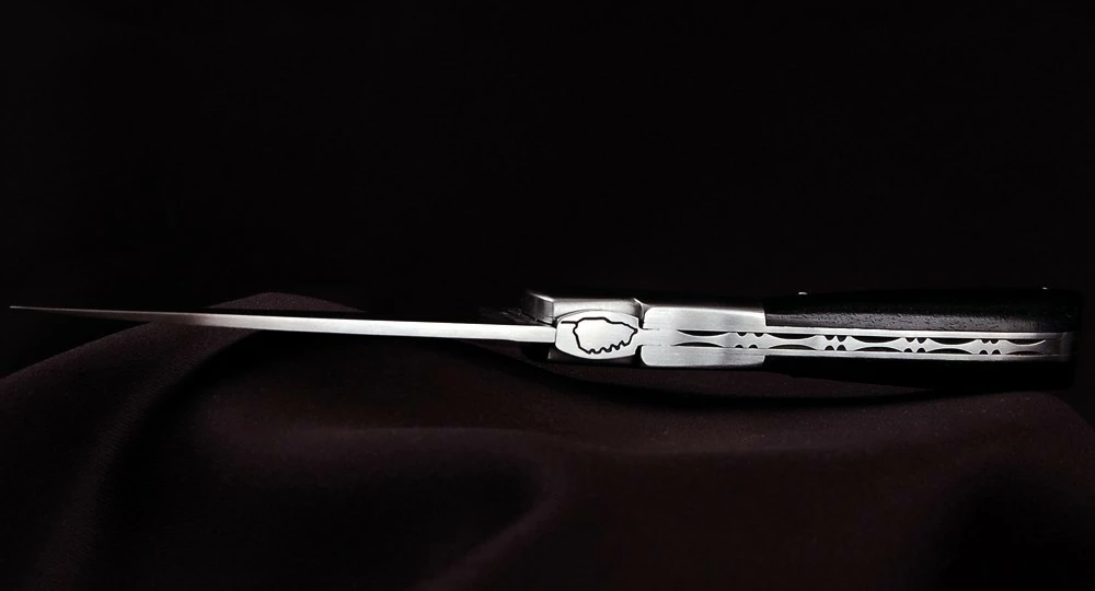La Vendetta en Ebène est disponible en acier inoxydable 14C28N et en acier Carbone XC 75 Brossé. Il est livré avec un étui ceinture en cuir.