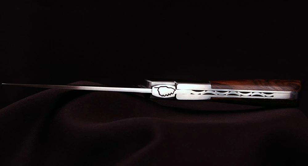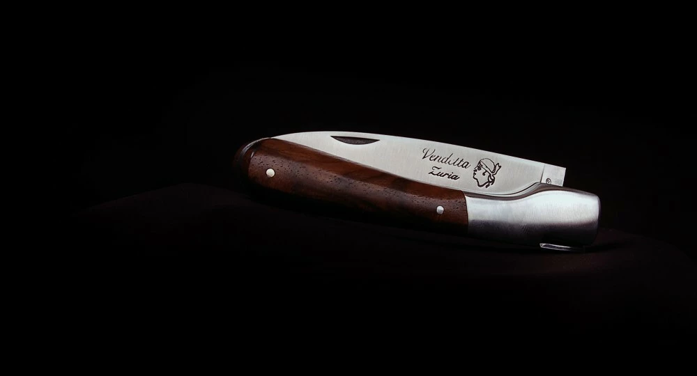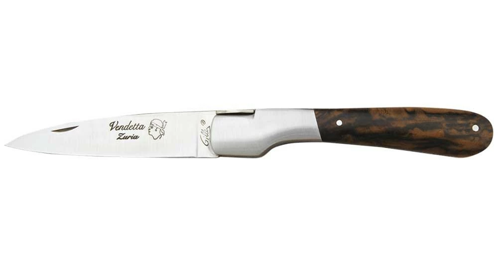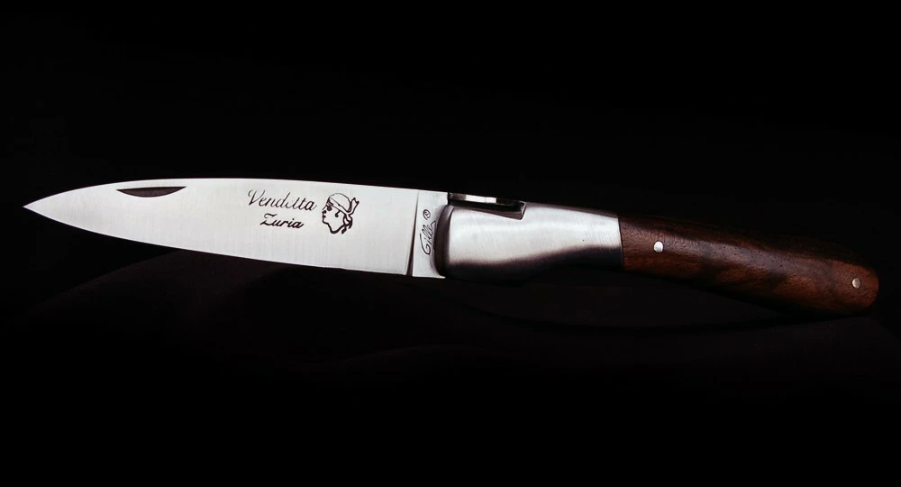 La Vendetta Zuria possède un système à cran forcé et un ressort à butée de lame empêche que celle-ci ne frappe le fond du couteau à la fermeture. Son ressort massif est forgé et poli à l’intérieur, la Corse est gravée sur le dessus, et il est décliné dans des matières nobles et des aciers de qualité.