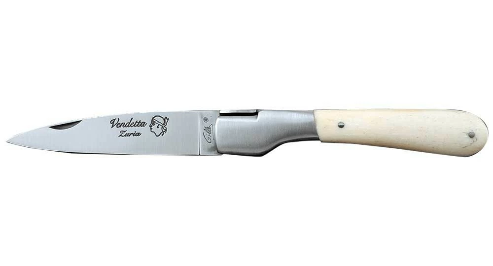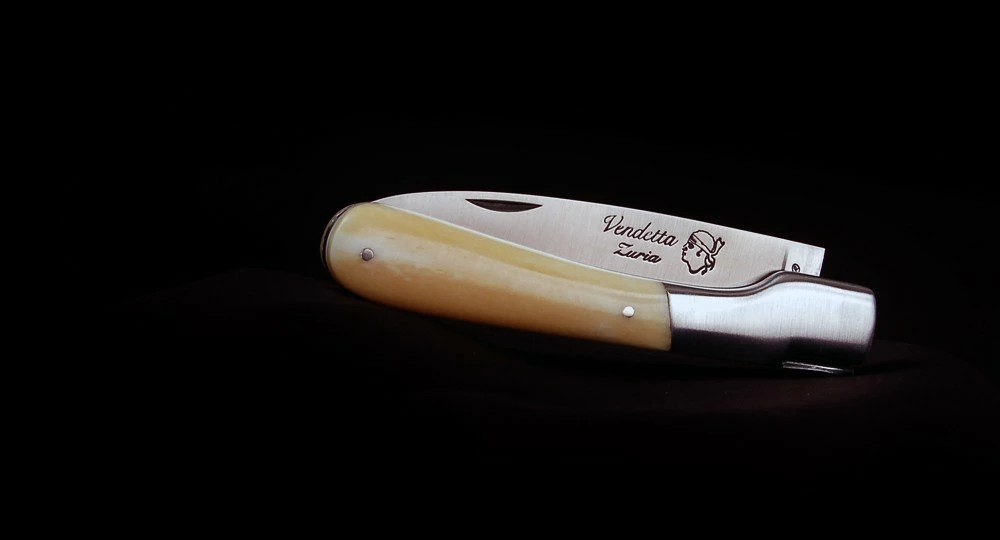 La Vendetta Zuria possède un système Ă cran forcĂ© et un ressort Ă butĂ©e de lame empĂŞche que celle-ci ne frappe le fond du couteau Ă la fermeture. Son ressort massif est forgĂ© et poli Ă l’intĂ©rieur, la Corse est gravĂ©e sur le dessus, et il est dĂ©clinĂ© dans des matières nobles et des aciers de qualitĂ©.