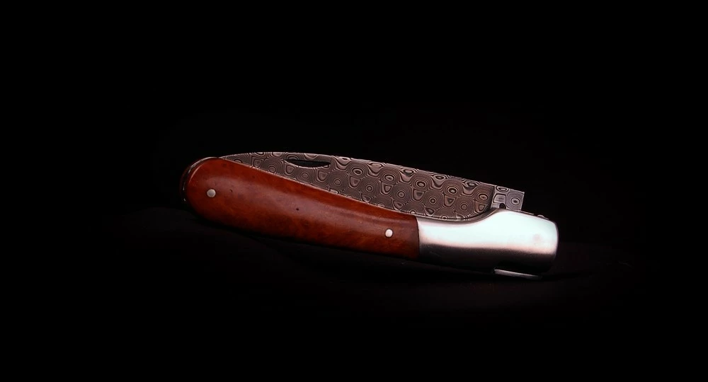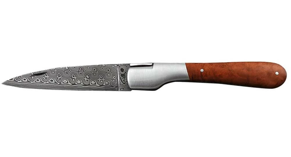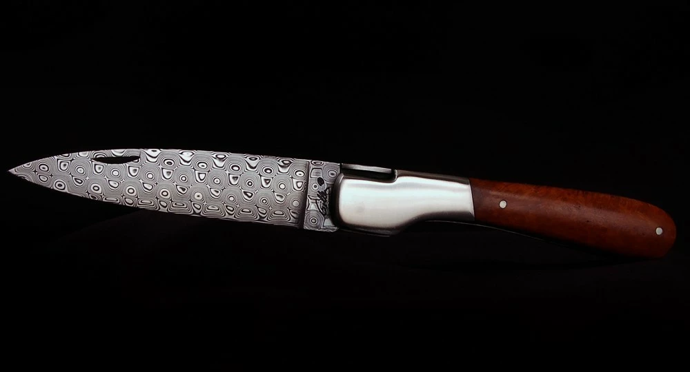 Lame : Acier Damas « rose » inoxydable, dureté 56 – 57Hrc