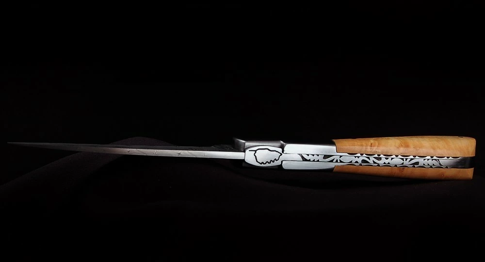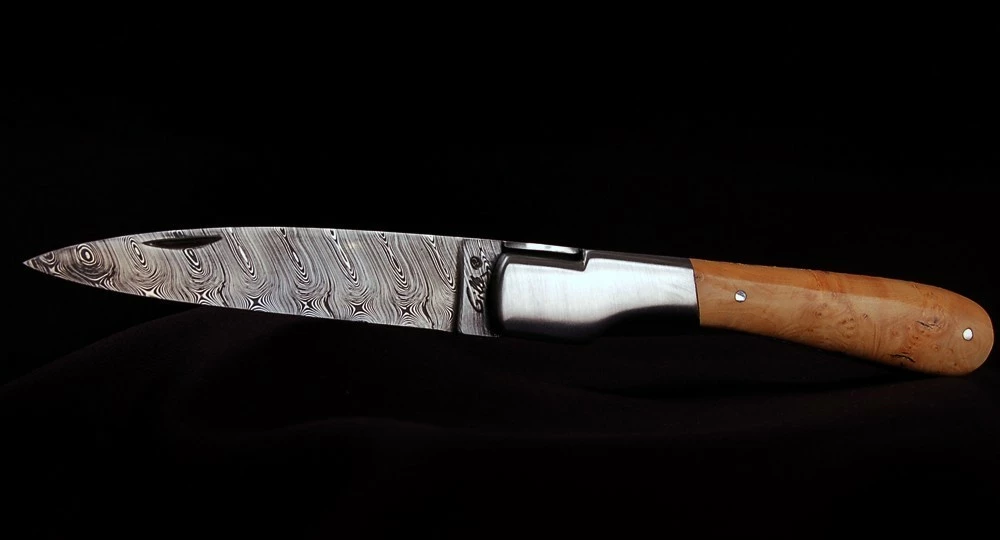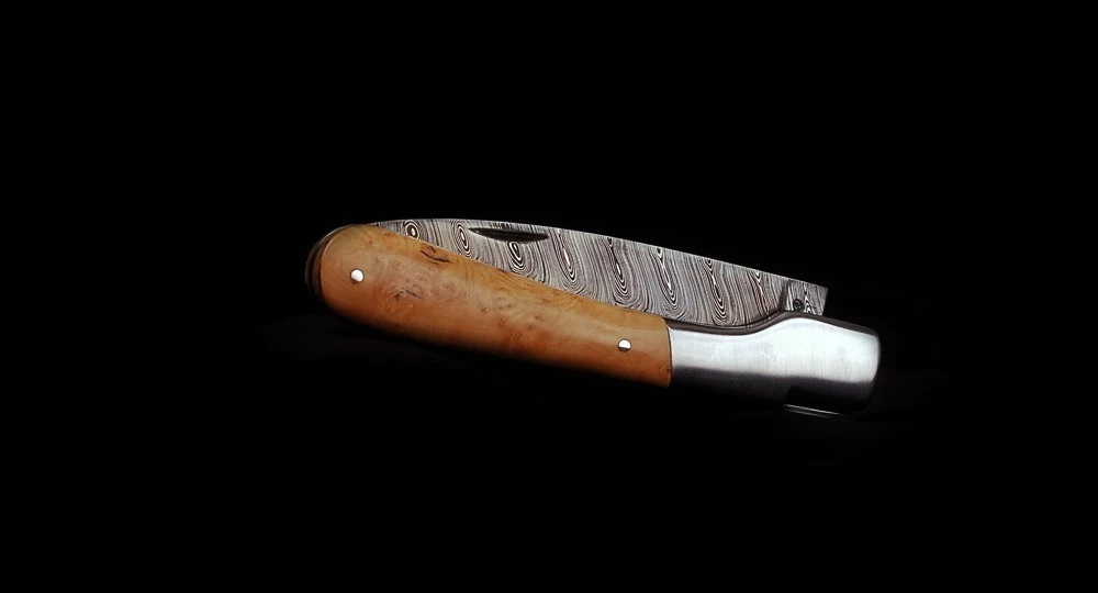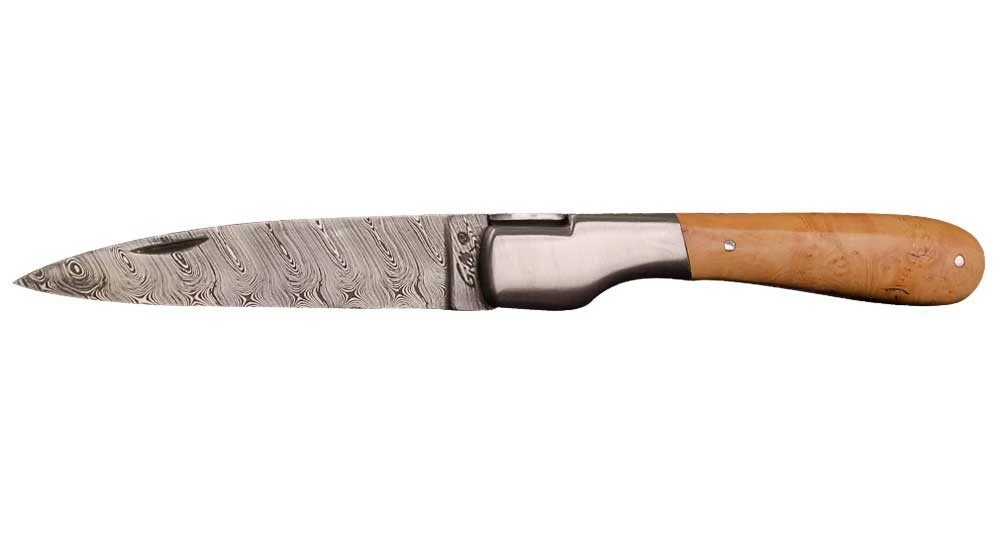 Couteau fait main : La Vendetta Zuria en Loupe de Buis et lame Damas