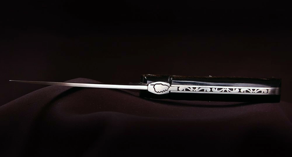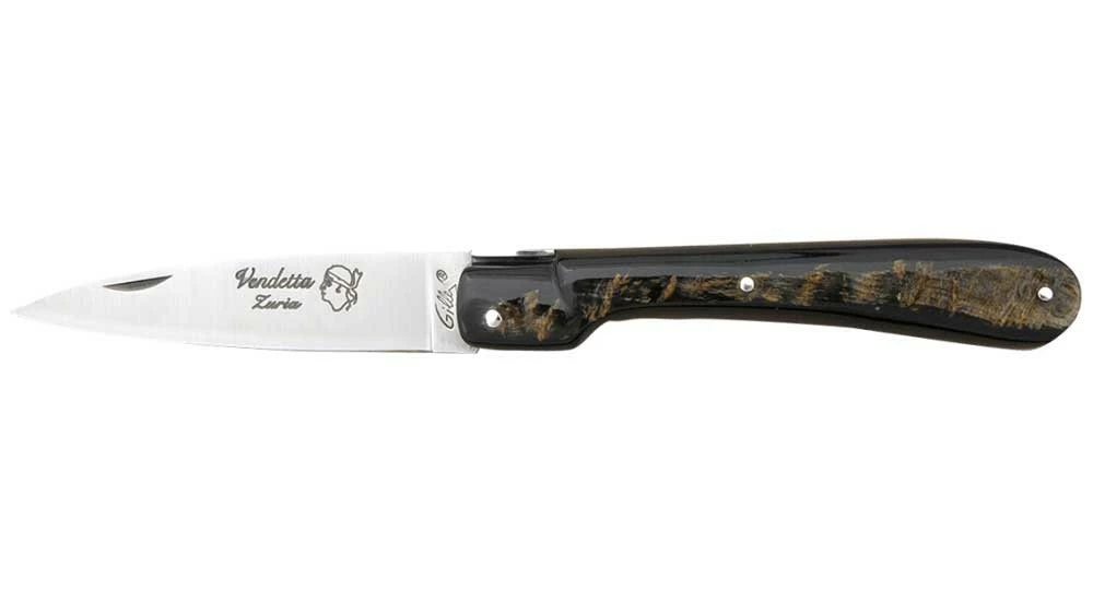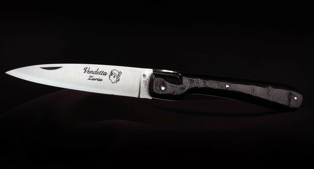 La Vendetta Zuria possède un système à cran forcé et un ressort à butée de lame empêche que celle-ci ne frappe le fond du couteau à la fermeture. Son ressort massif est forgé et poli à l’intérieur, la Corse est gravée sur le dessus, et il est décliné dans des matières nobles et des aciers de qualité.