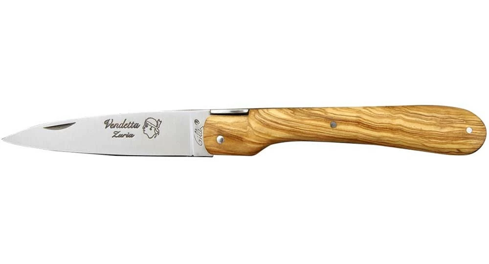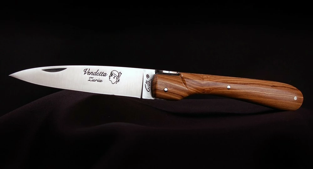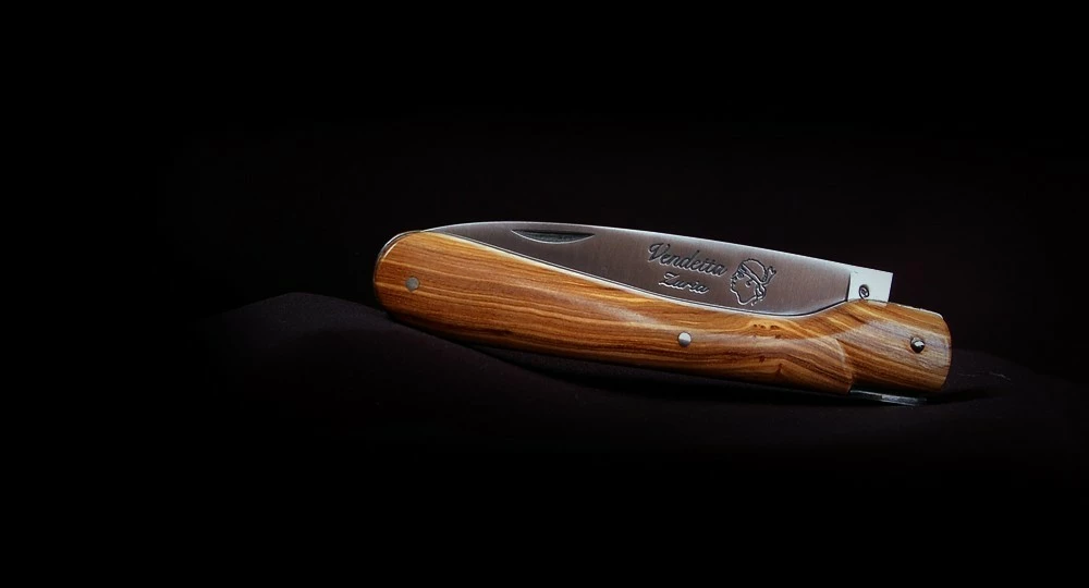 La Vendetta Zuria possède un système à cran forcé et un ressort à butée de lame empêche que celle-ci ne frappe le fond du couteau à la fermeture. Son ressort massif est forgé et poli à l’intérieur, la Corse est gravée sur le dessus, et il est décliné dans des matières nobles et des aciers de qualité.