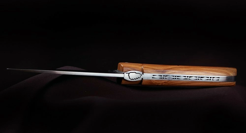 La Vendetta plein manche en Olivier est disponible en acier inoxydable 14C28N et en acier Carbone XC 75 Brossé. Il est livré avec un étui ceinture en cuir.