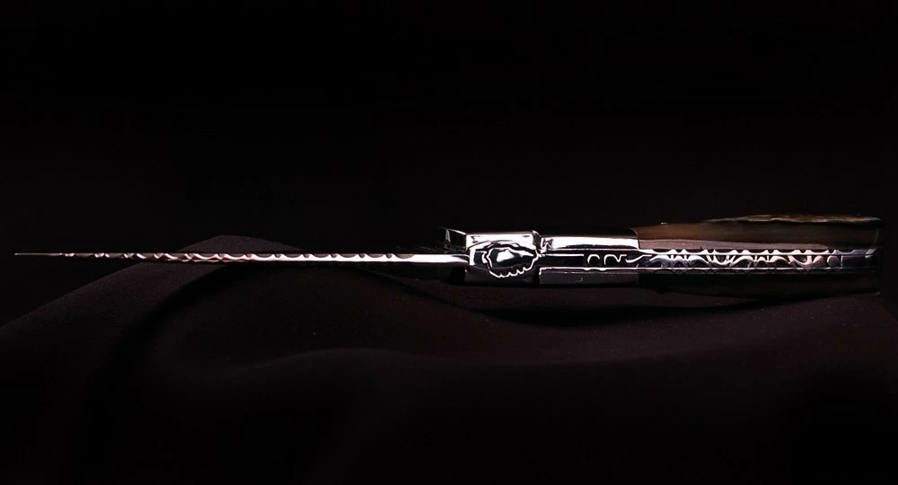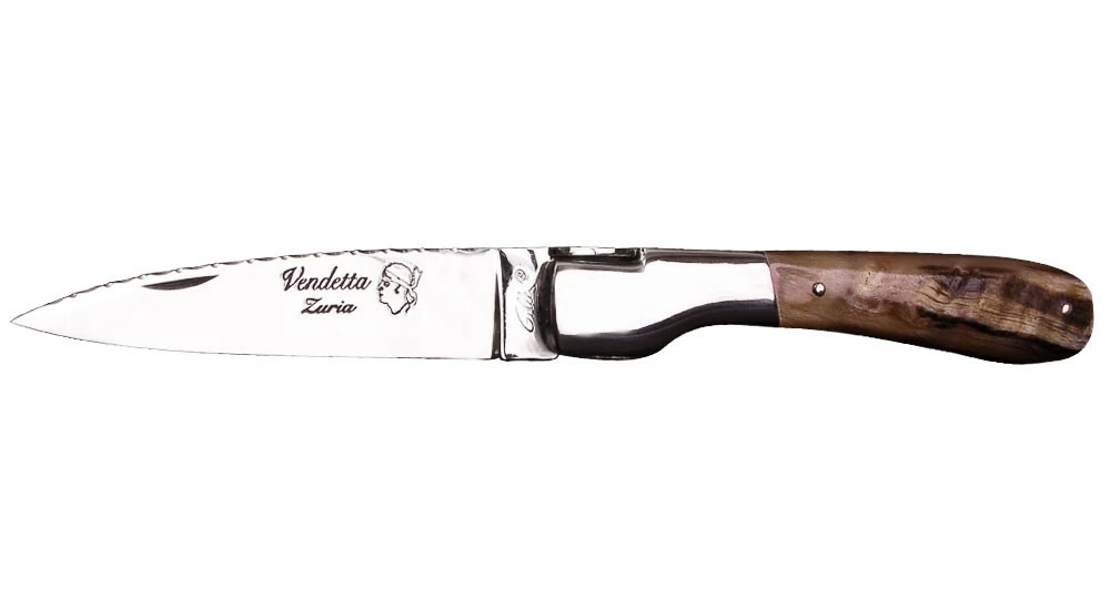 La Vendetta Zuria possède un système Ă cran forcĂ© et un ressort Ă butĂ©e de lame empĂŞche que celle-ci ne frappe le fond du couteau Ă la fermeture. Son ressort massif est forgĂ© et poli Ă l’intĂ©rieur, la Corse est gravĂ©e sur le dessus, et elle est dĂ©clinĂ©e dans des matières nobles et des aciers de qualitĂ©.
