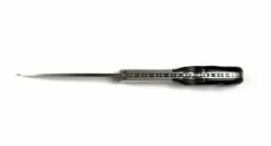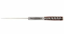 Cette Vendetta tire-bouchon a évolué et elle est équipée maintenant d’un système de sécurité appelé Push-button (bouton poussoir). Ce système de sécurité est un cran de sûreté qui s’actionne grâce au bouton placé sur la mitre en acier, pour déverrouiller la lame et replier le couteau. Cela évite qu’il se referme sur les doigts de façon inopinée.