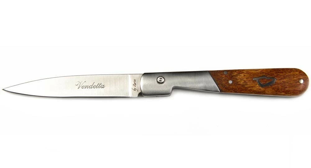 Les Couteliers corses Zuria ont travaillé à l’élaboration de la nouvelle Vendetta en repensant le système de fermeture pour qu’il puisse se fermer facilement avec une seule main, en toute sécurité. La lame est signée by Zuria ce qui garantit un couteau avec un excellent rapport qualité/prix et un Design personnalisé. Le bouton sur la mitre débloque la lame permettant de fermer le couteau avec une seule main. La Vendetta Una Mano est également disponible en bois d’Olivier et des modèles pour enfants avec une lame à bout rond ont été créé.