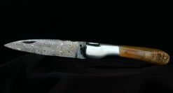 Lame : Acier inoxydable suédois 14C28N épaisseur 3 mm au talon. Dureté : 58 -59 Hrc, bonne capacité de coupe et d’affutage